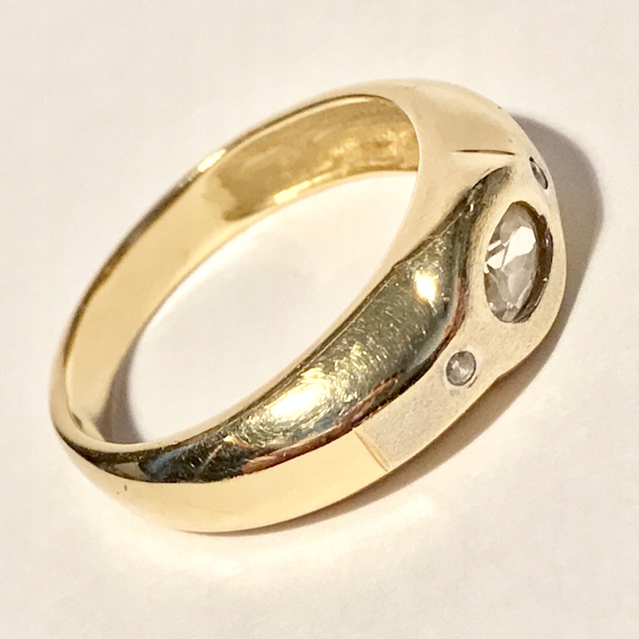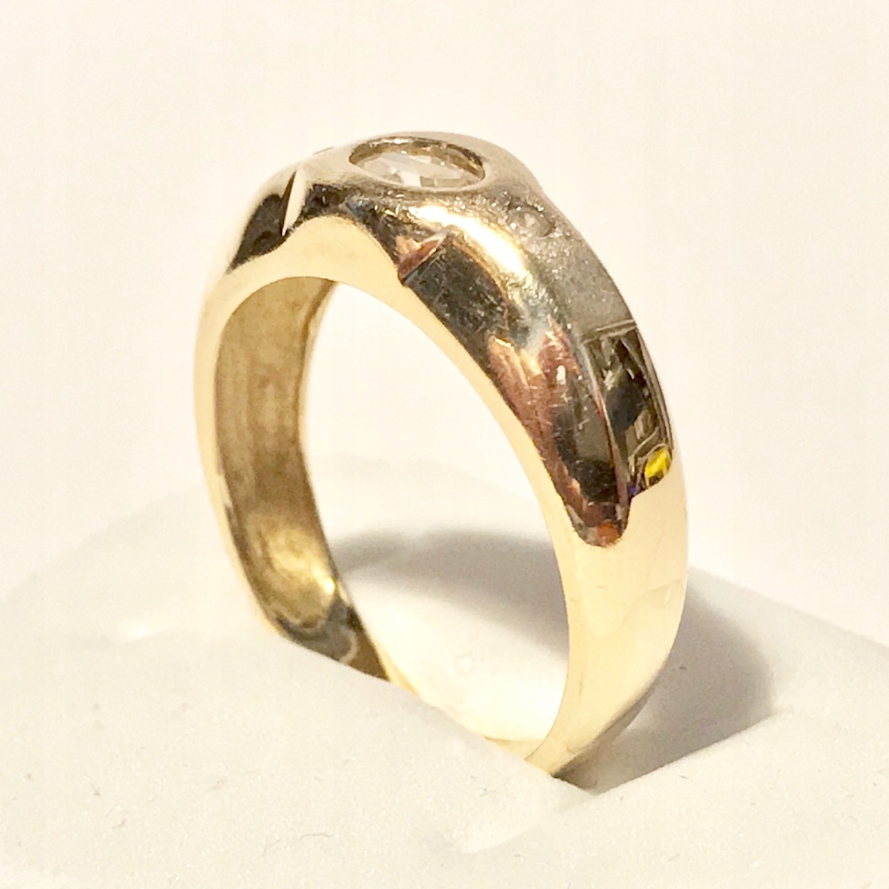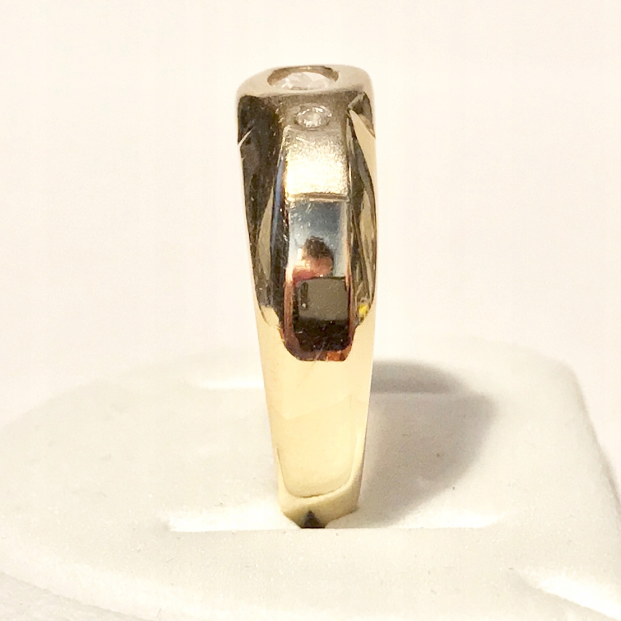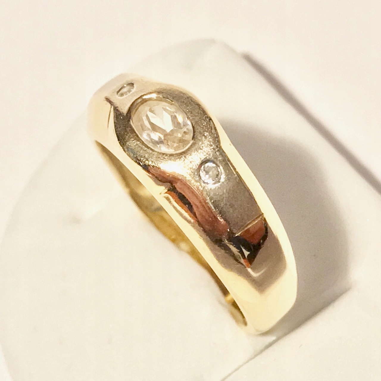 - Przepiękny bardzo oryginalny pierścionek wykonany z żółtego 14-karatowego złota. Duża cyrkonia na topie w sąsiedztwie dwóch mniejszych.