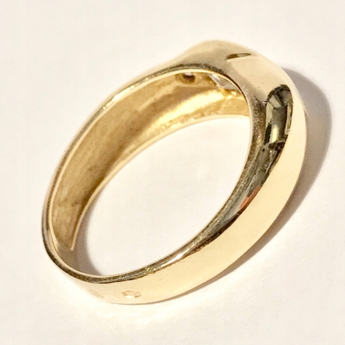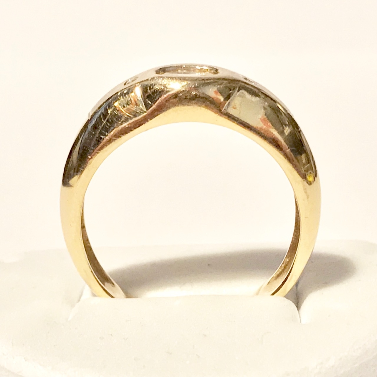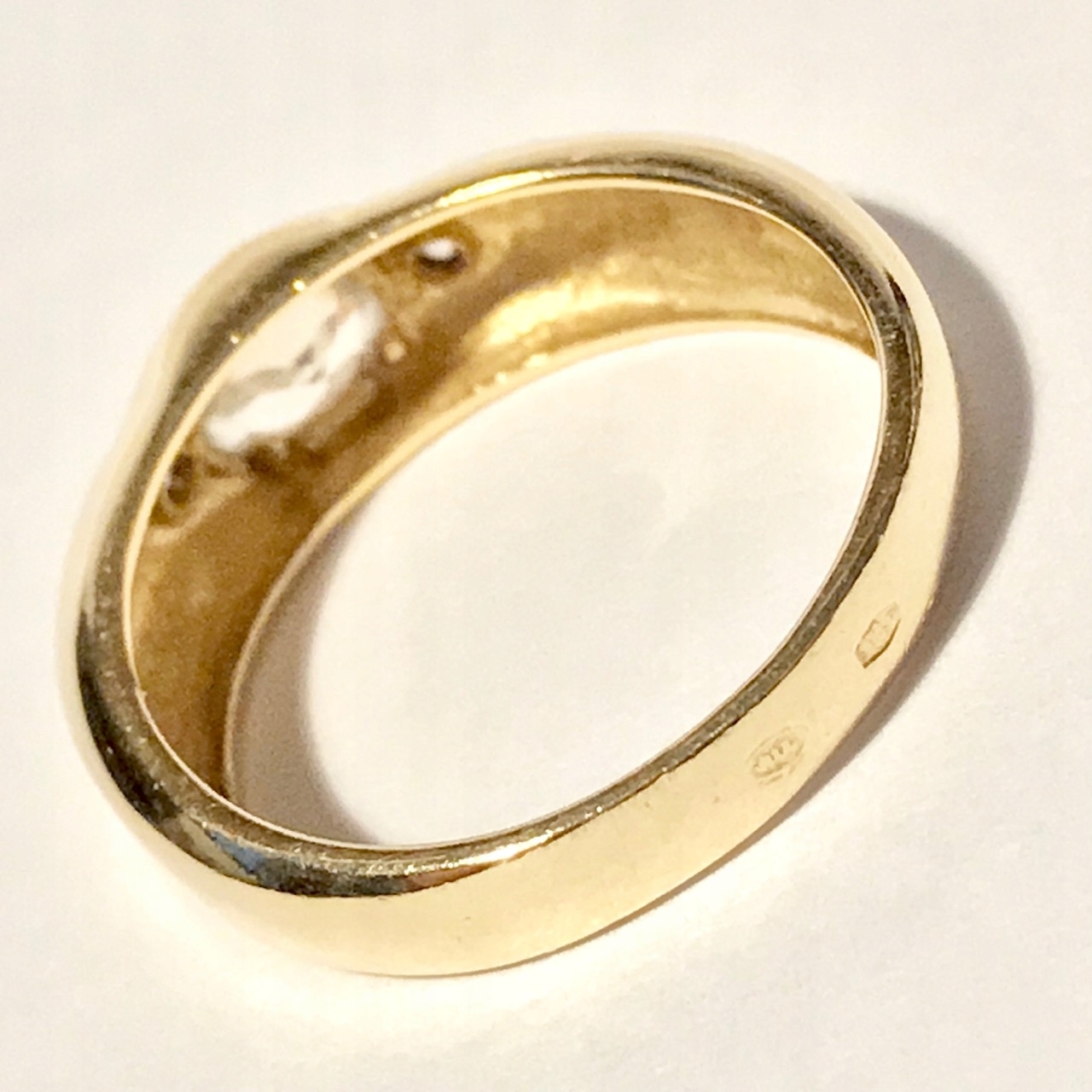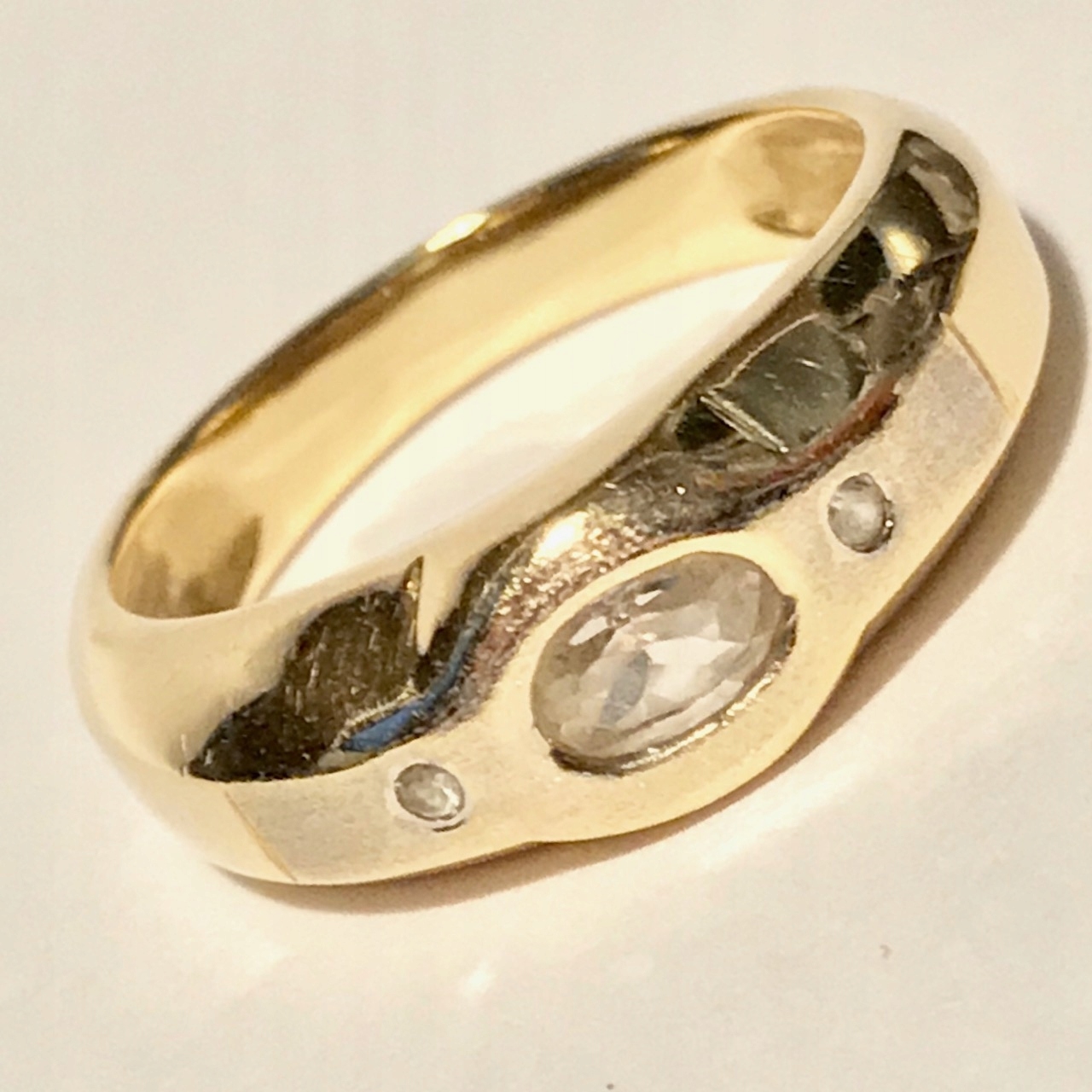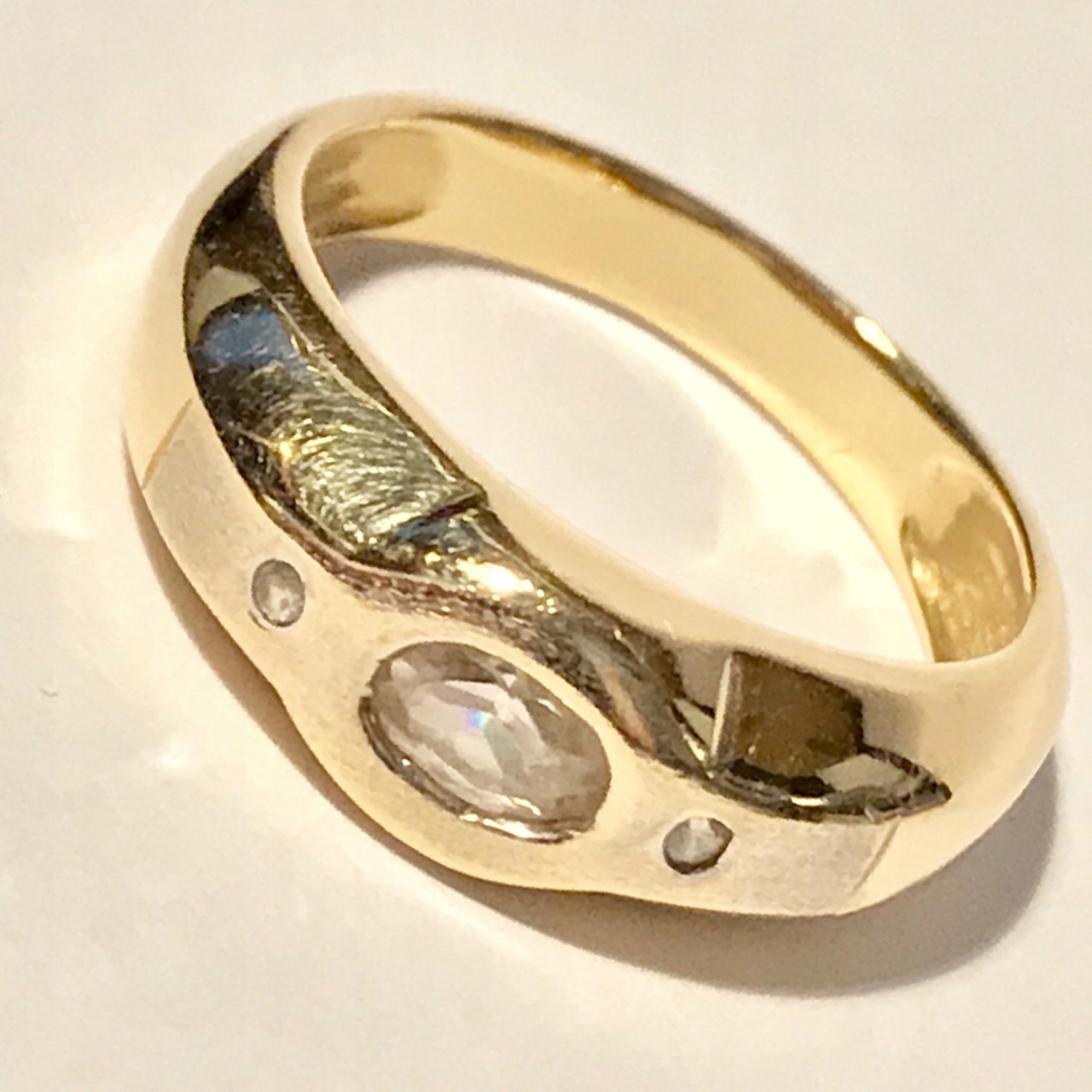- Przepiękny bardzo oryginalny pierścionek wykonany z żółtego 14-karatowego złota. Duża cyrkonia na topie w sąsiedztwie dwóch mniejszych.