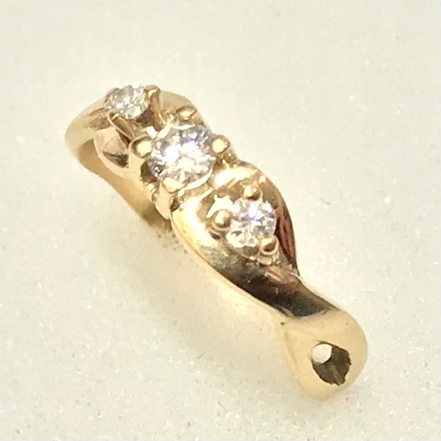 - Diament główny – środkowy ma masę 0.15ct; diamenty poboczne – 0.05ct każdy.
