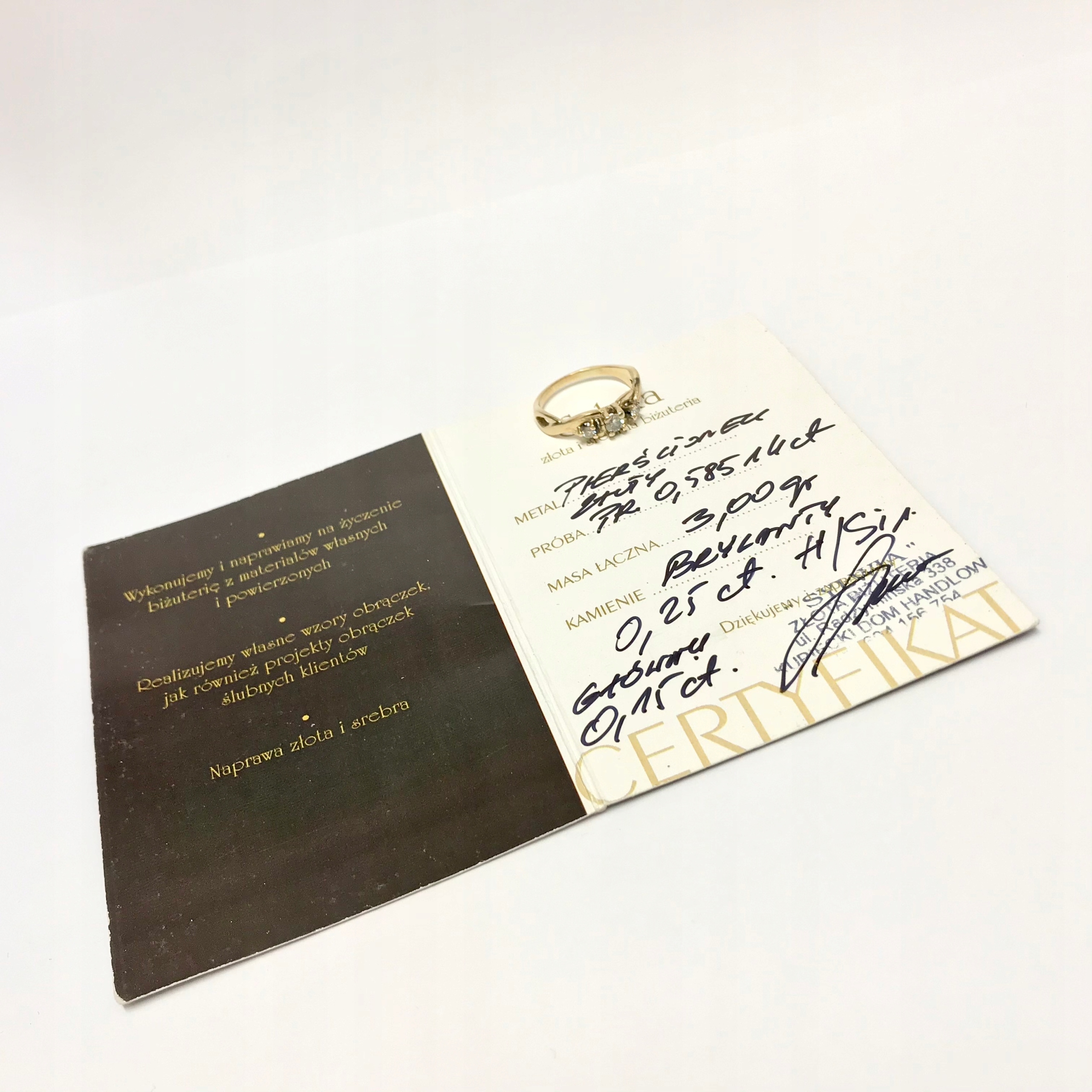 - Pierścionek, ozdobne pudełeczko, certyfikat.