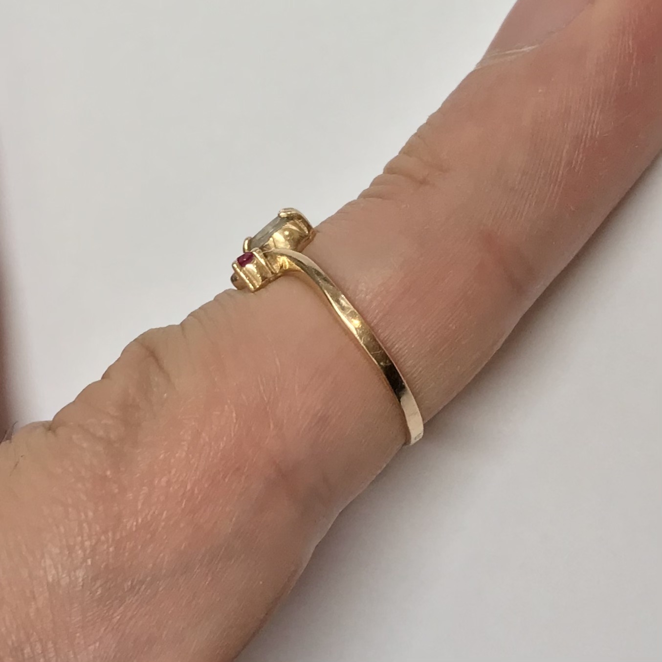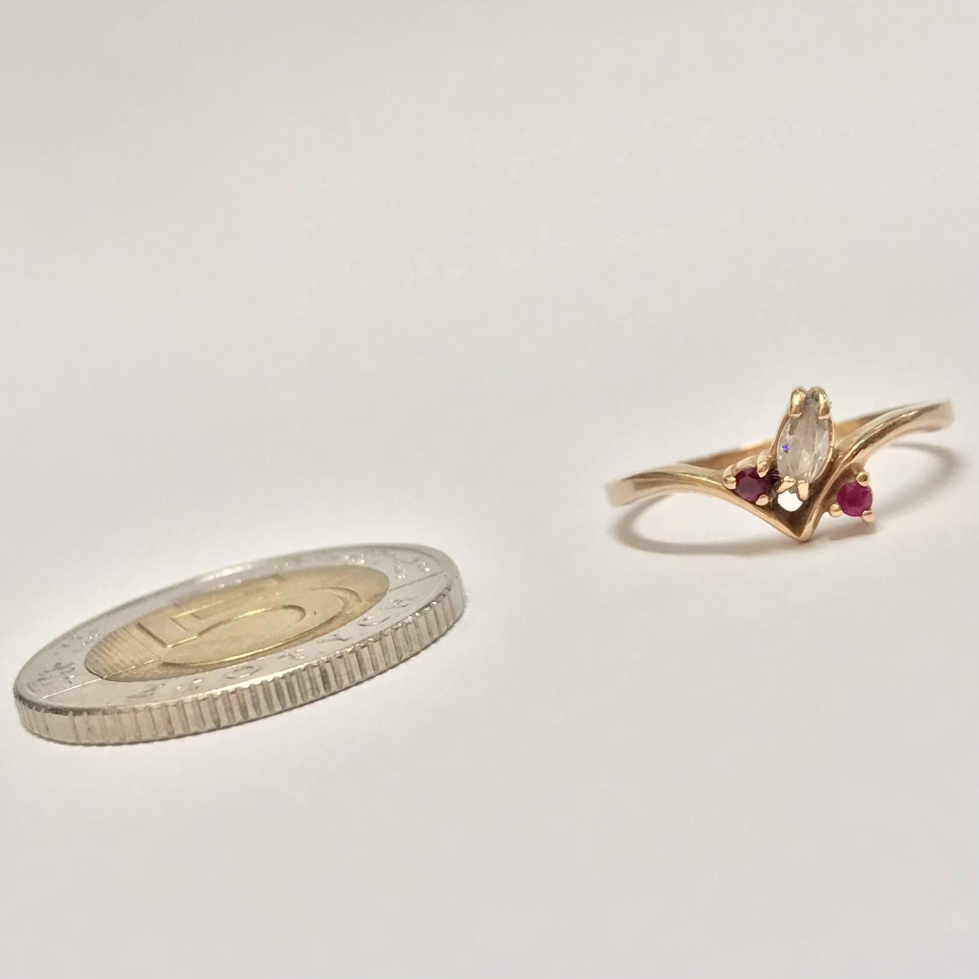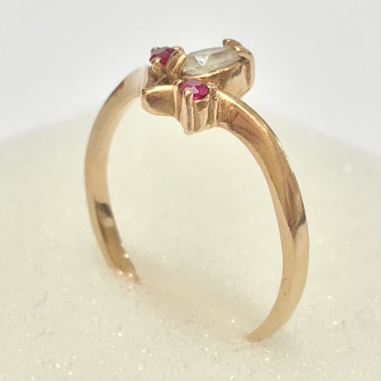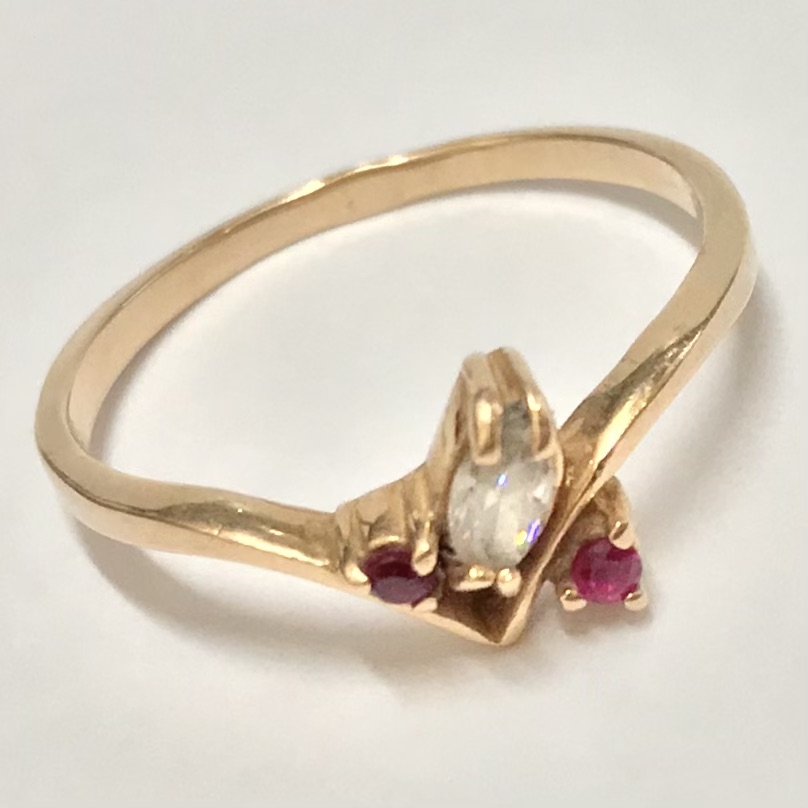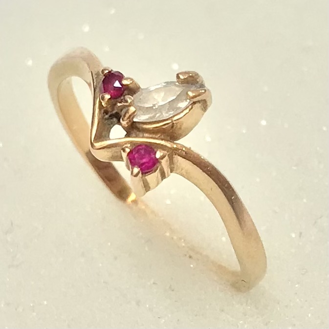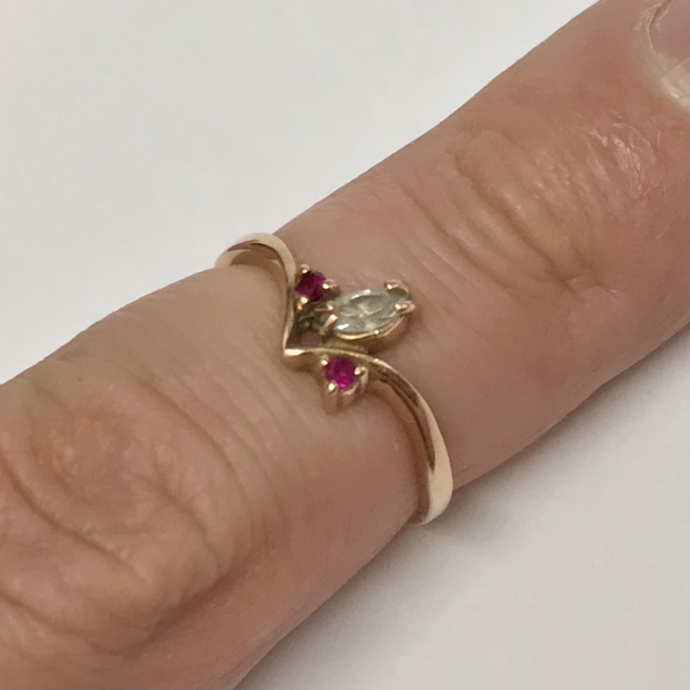 Subtelny i bardzo kobiecy pierścionek z różowego złota 14K (próba 585). W centrum znajduje się jasny kryształ w kształcie markizy (marquise), a po bokach dwa akcenty w kolorze głębokiej purpury – ametysty. Oprawa ma lekką, nowoczesną linię w kształcie „V”, dzięki czemu pierścionek wygląda smukło na palcu i pięknie odbija światło z każdej strony.