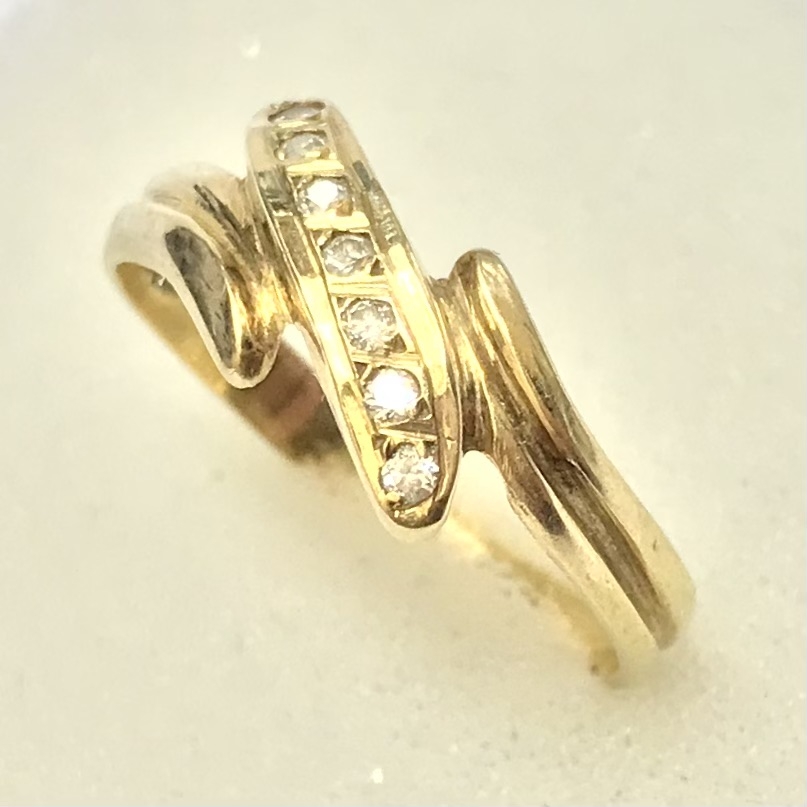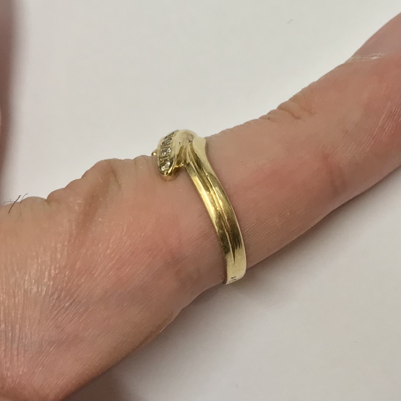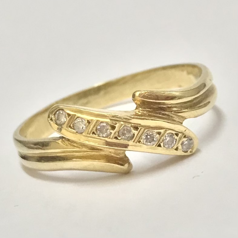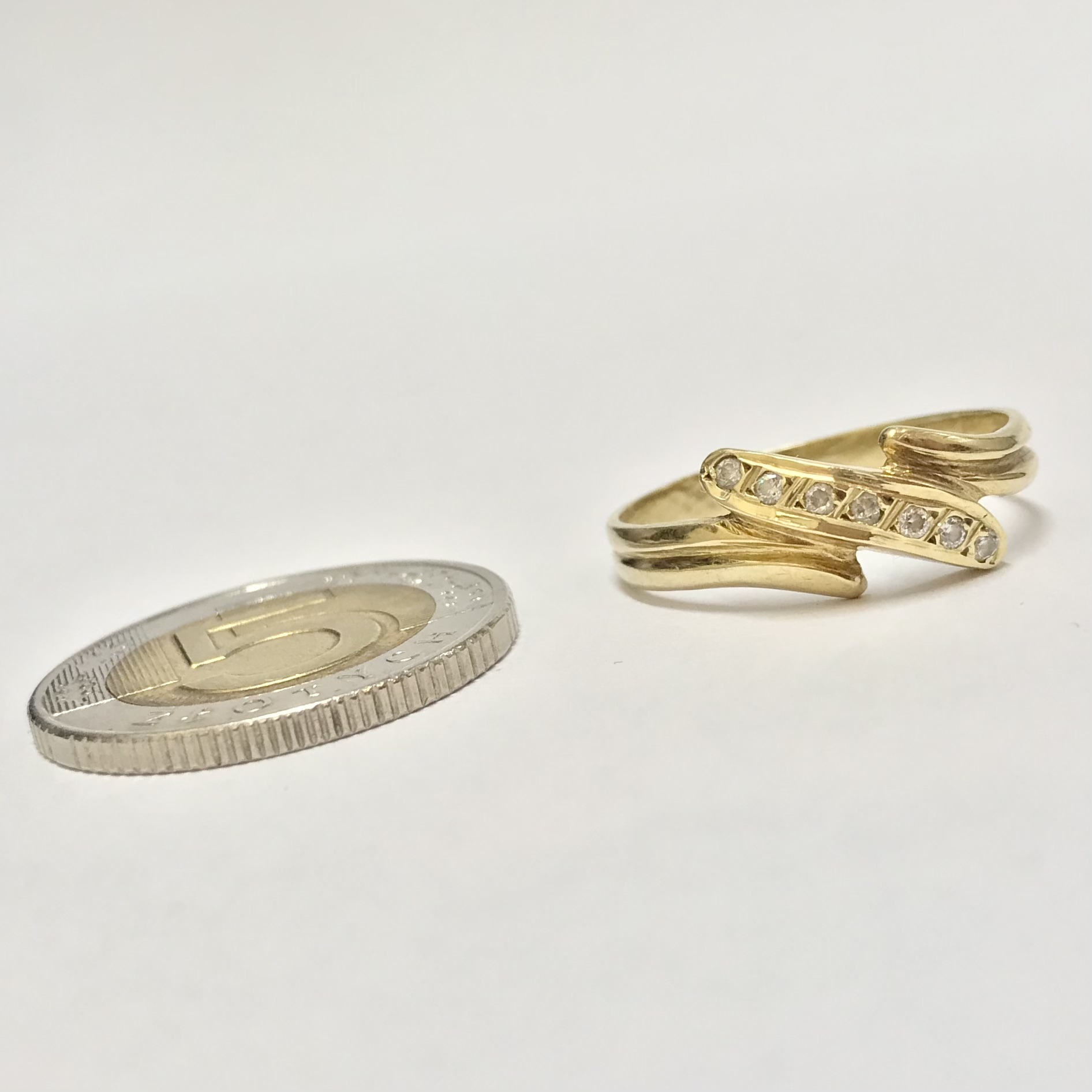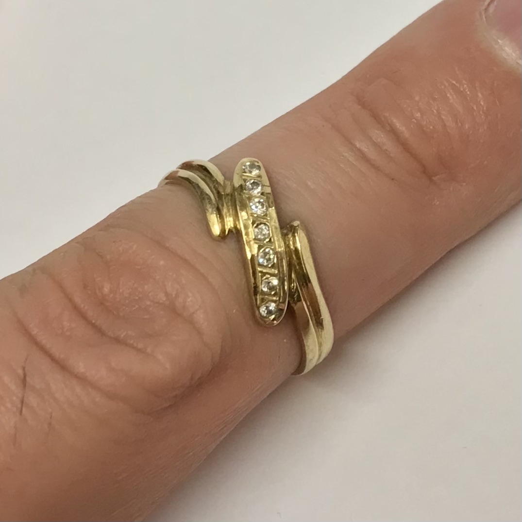 Ten złoty pierścionek 585 z cyrkoniami ma nowoczesny, „bypassowy” kształt otulający palec i rząd ręcznie oprawionych cyrkonii, które pięknie łapią światło przy każdym ruchu dłoni.